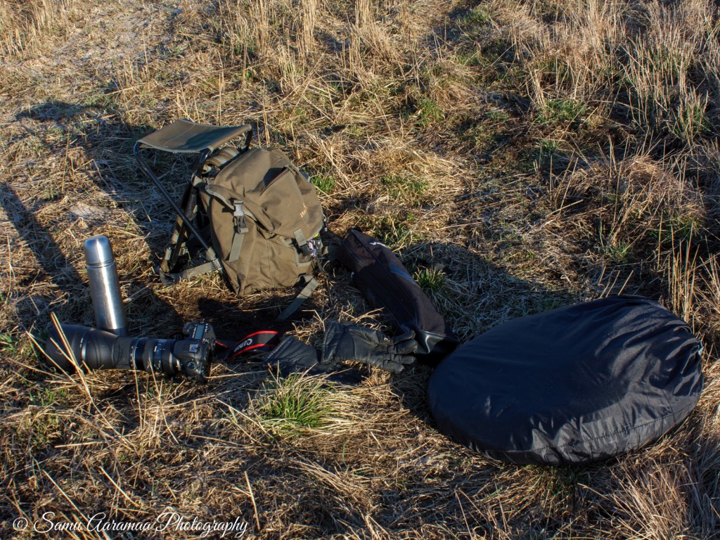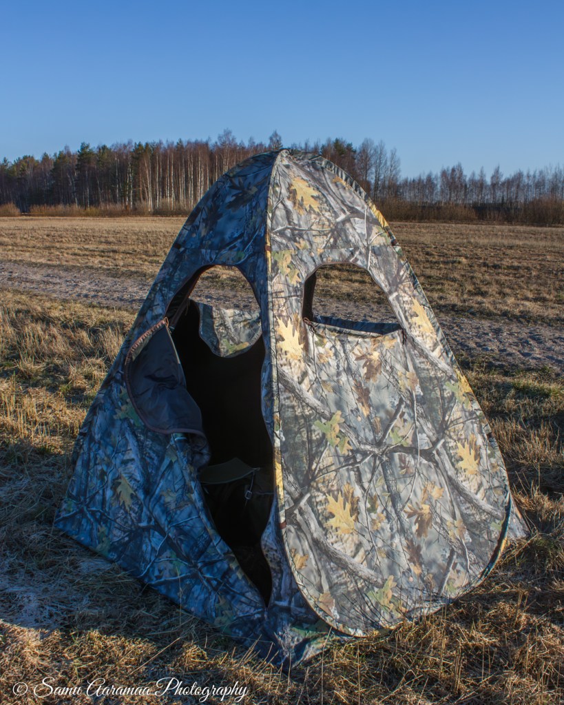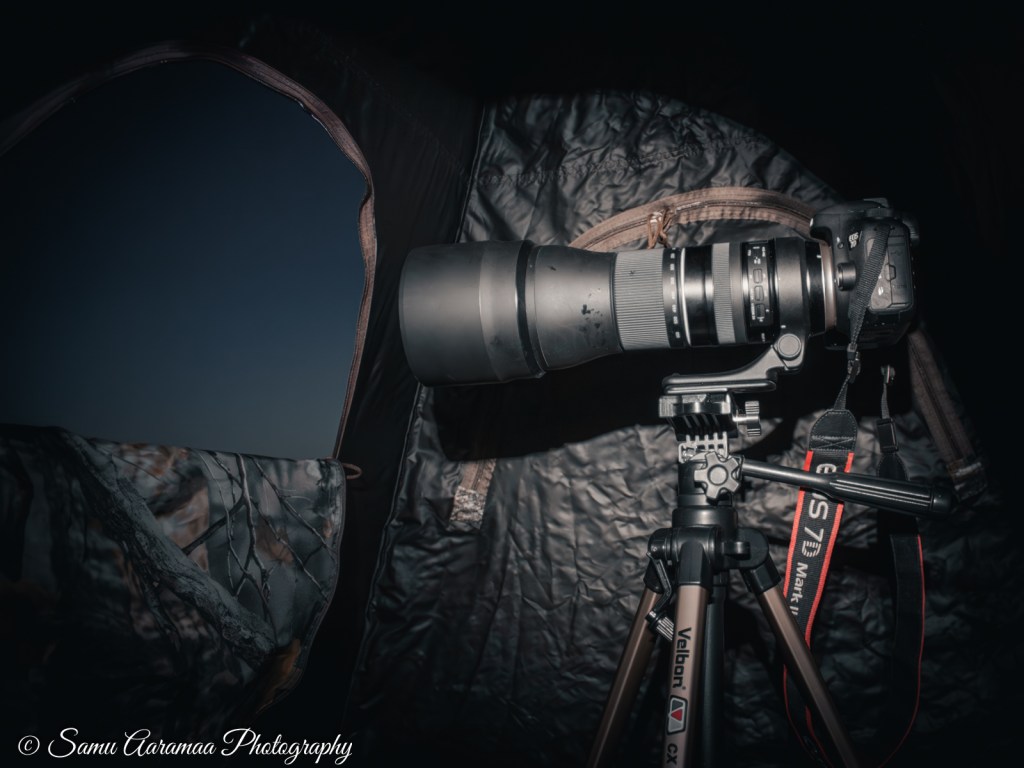 Teltta valmiina, kamera valmiina, mies valmiina. Vain kuvauskohteet puuttuvat. Edellisenä vuonna minulla oli objektiivina vain Tamronin 70-300 mm, nyt 150-600 mm. Tässä kohtaa odotan todella innoissani pääseväni tositoimiin. Kamerana on vain kroppikennoinen Canon 7D Mark II, joka ei hämärässä kuvaamiseen ole ideaalinen.