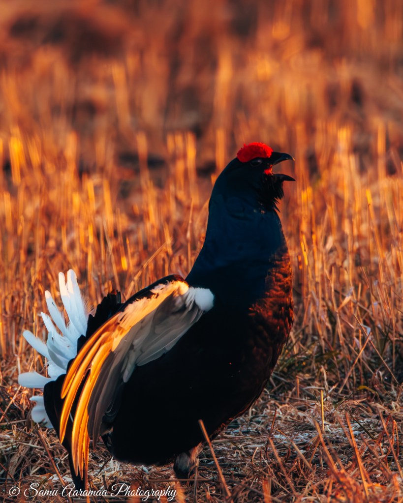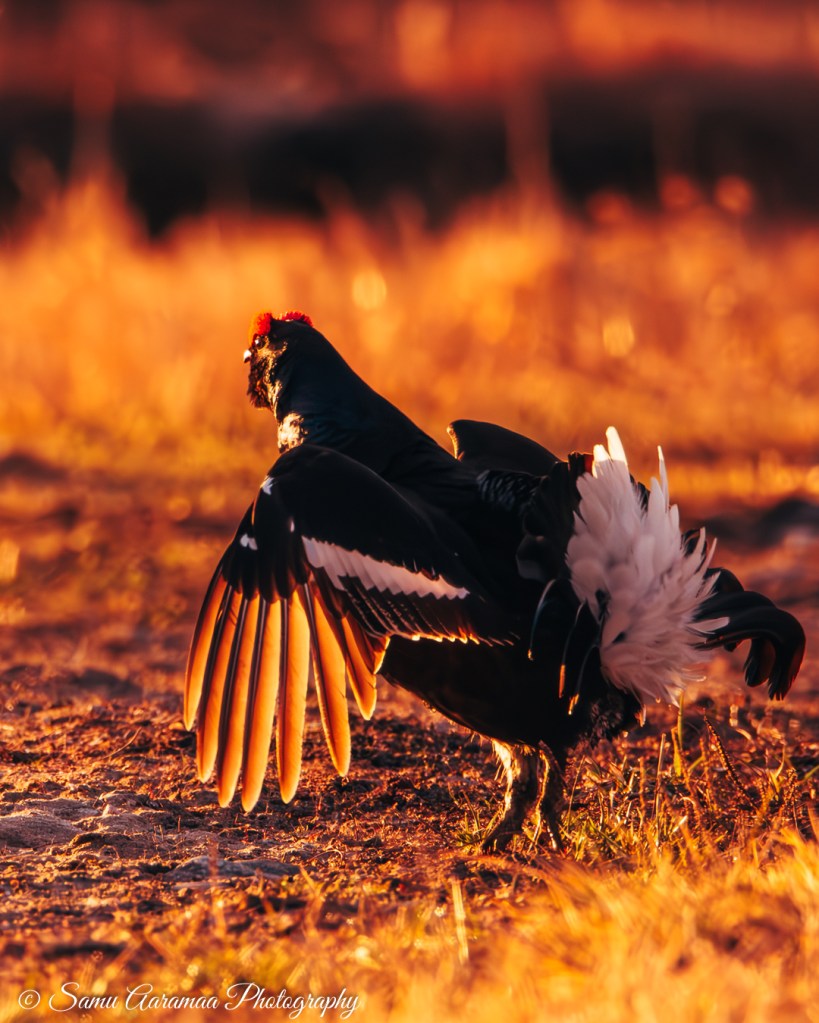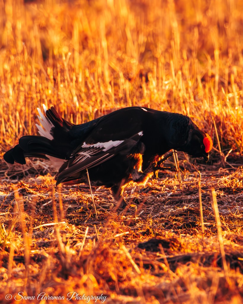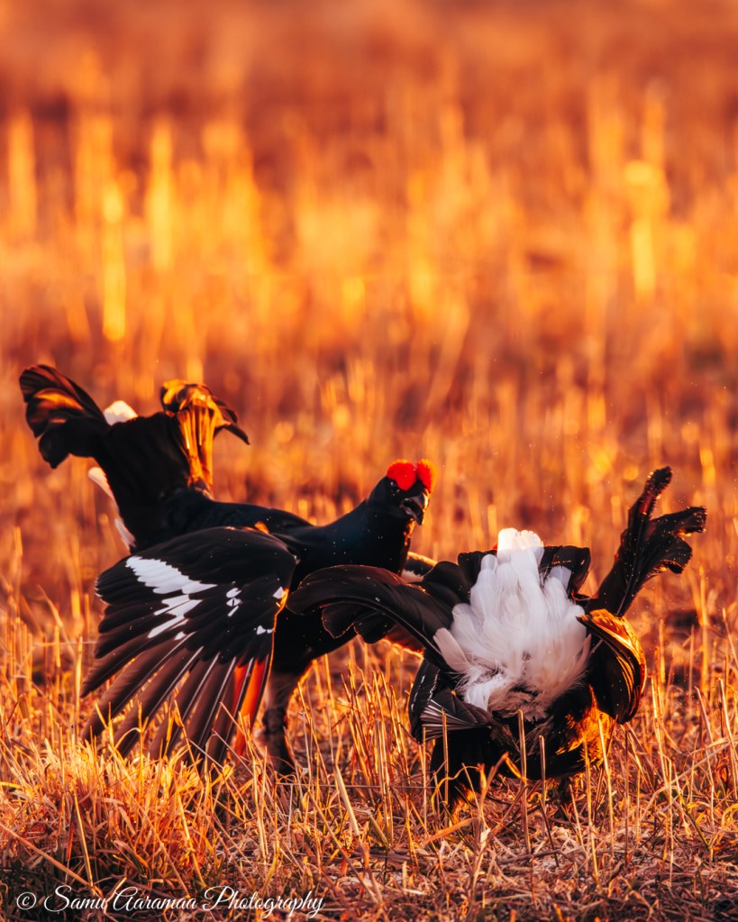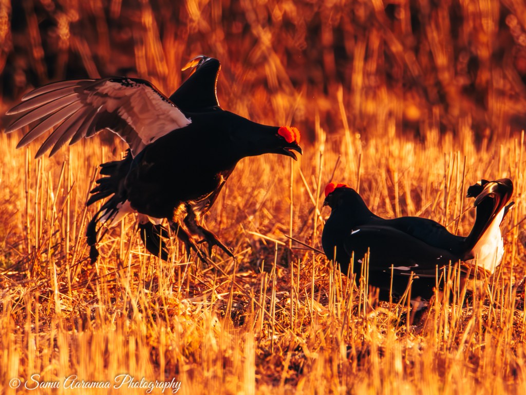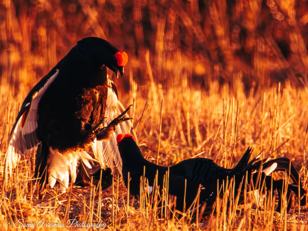 Pian teerien suhina ja pulputus täyttää tienoon. Tunne on sanoinkuvailemattoman maaginen. Siinä jos missä irtaantuu todellisuudesta, aika kadottaa merkityksensä ja sitä elää vain siinä hetkessä. Ryhdyn kuvaamaan teeriä enemmän ja enemmän. Ensin vain innoissani kun saan linnun ruudulle, sitten enemmän ja enemmän tarkoituksenhakuisesti hyviä tilanteita kalastaen. Teeret tarjoavatkin ruudun täydeltä katsottavaa. Teerien peli ei ole mitään leikkiä, vaan totisinta totta ja välillä raakaakin. Siinä on kyse naaraiden huomiosta eli suvunjatkamisesta, omat geenit pitää saada eteenpäin. Vanhemmat ja vahvemmat teeret ovat keskellä soidinaluetta, kun nuoret linnut joutuvat tyytymään reunapaikkoihin. Naaraat tulevat paikalle sitten kun parhaaksi katsovat, tästä tulee mieleen jokin muukin laji, mutta en nyt tähän hätään yhtään muista mikä.
