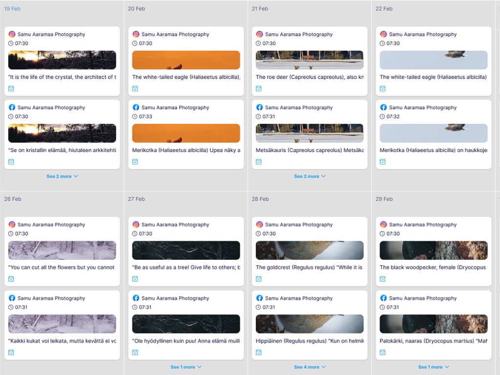Mutta se ei vielä minulle riitä. Haluan esimerkiksi jakaa saman kuvan, mutta Facebookissa laitan suomenkielisen tekstin ensin ja sitten vasta englanninkielisen – Instagramissa toisinpäin. Käytän myös eri avainsanoja eri alustoilla. Facebookin Meta Business Suitessa tämä on mahdollista, mutta ominaisuuksia puuttuu vielä. Esimerkiksi Publerissa pystyy valitsemaan myös, mihin albumiin kuva julkaistaan Facebook-sivulla. Ja siellä voi myös lähettää kommentin heti julkaisun perään tai ajastaa sen.