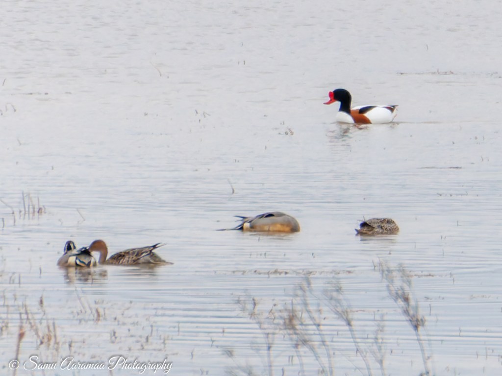 Seuraava etappi piti olla Jalasjärven Hirvijärvellä, Ventelän lintutornissa. Tie sinne meni kuitenkin minun makuuni vähän turhan intiimisti jonkun pihan läpi, jossa joku vanha mies touhusi. Vaihdoin suunnitelmaa ja lähdin kohti Hirvijärven vanhaa lintutornia järven koilliskulmaan. Ei tarvinnut mennä sinne asti, kun näin järven tulvapaikan, joka kuhisi lintuja. Siellä havainnoin 14 lajia ja karkealla arvioinnilla vajaa 300 lintua. Lajeja oli edustettuna: tundrahanhi, metsähanhi, laulujoutsen, ristisorsa, sinisorsa, jouhisorsa, tavi, nokikana, kurki, töyhtöhyyppä, naurulokki, ruskosuohaukka, naakka ja kiuru. Ristisorsasta tuli vuosipiste ja elispiste eli näin sen ensimmäistä kertaa elämässäni. Komea lintu! Jouhisorsankin näin kunnolla vasta tuossa lutakossa. Samoin vuosipiste tuli ruskosuohaukasta. Valitettavasti välimatkaa lintuihin oli sen verran, että kuvat ovat mitä ovat. Mutta oli huikea pysähdys, eikä tarvinnut olla montaa minuuttia paikallaan, kun lajikirjo tuli selväksi.