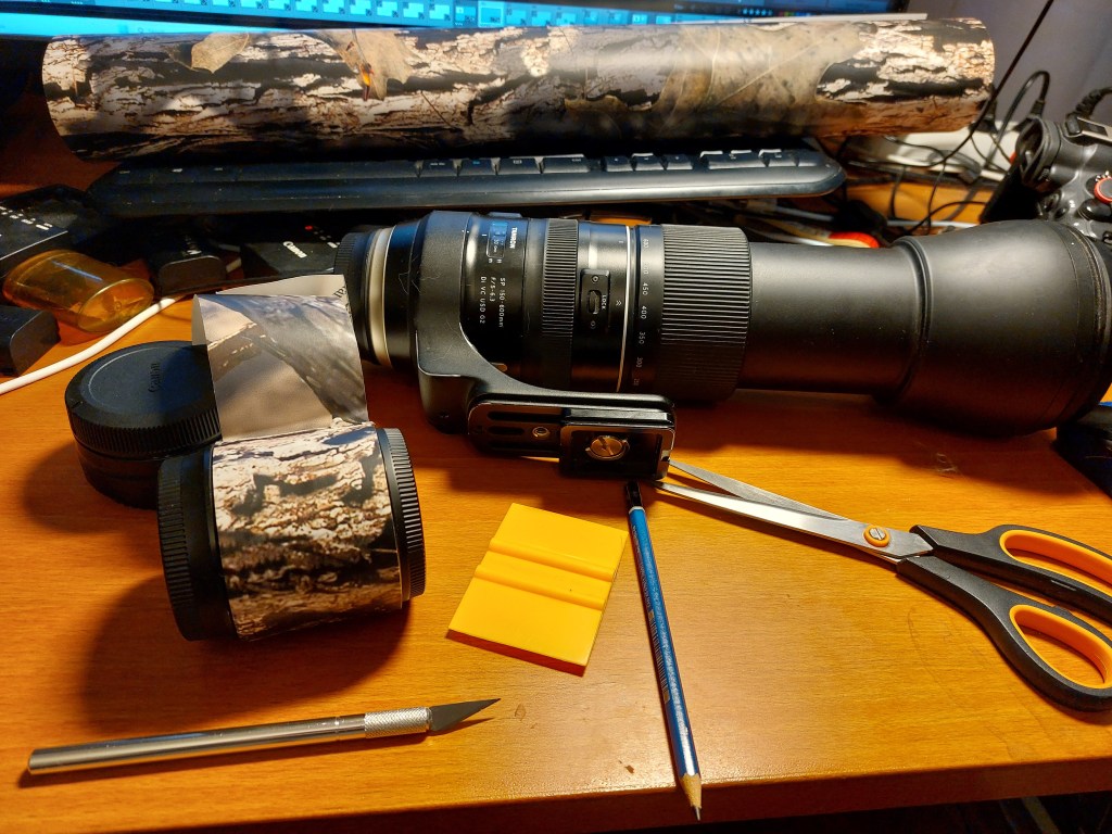 Löysin netistä vinyylisuojan, joka ”liimataan” objektiivin päälle. Liimataan on tuossa lainausmerkeissä, koska kyseessä on tavallaan teippi, kuten kontaktimuovi, mutta ei ihan kuitenkaan. Jos vinyyli ei mene heti kerralla paikalleen, sen saa vetämällä pois, eikä alustaan jää mitään jälkeä. Kun se on paikallaan, sen saa pois lämmittämällä sitä vaikka hiustenkuivaajalla. Sekä neopreenisuojissa, että vinyylisuojissa on monia eri kuoseja, vinyylissä enemmän.