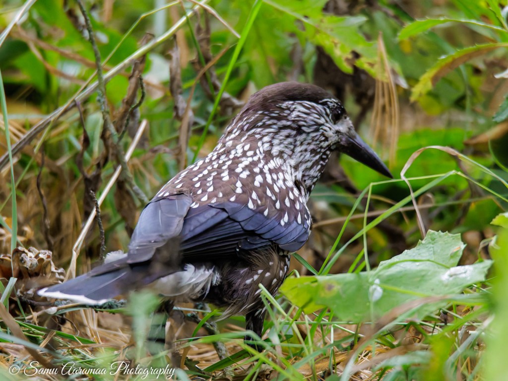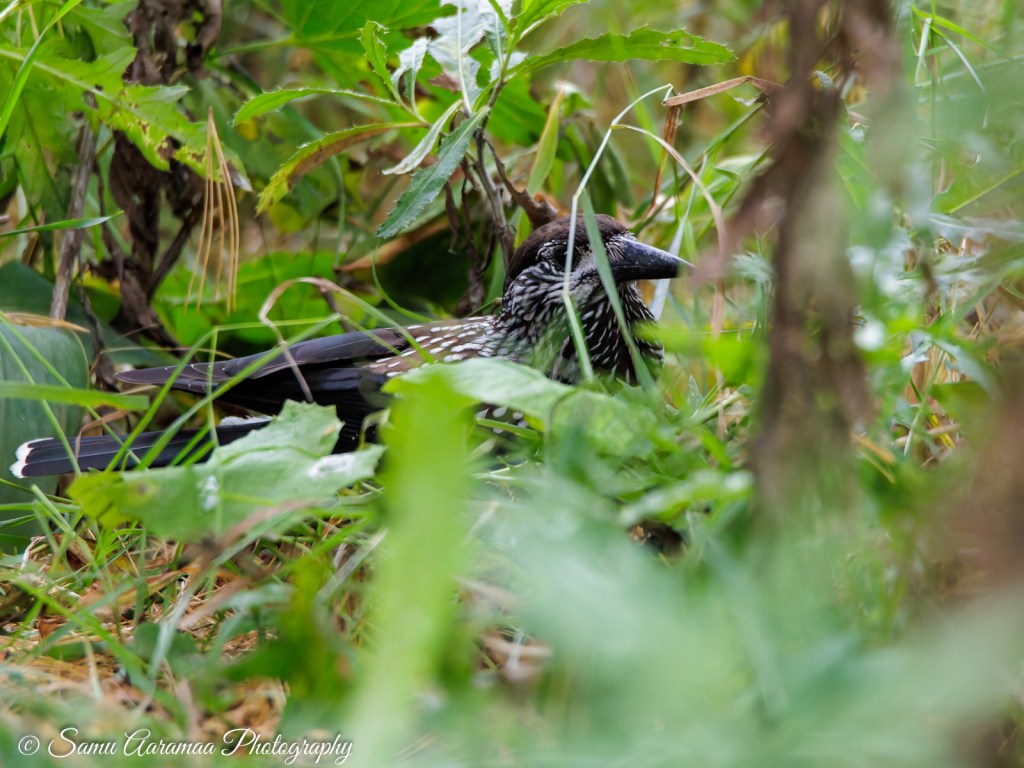 Aamun linturetki oli antoisa. Lähdin bongaamaan pähkinähakkeja, jotka löysinkin heti matkan alkupäässä. Kaksi lähti pois ennen kuin ehdittiin päivää sanoa, mutta yksi jäi kuvattavaksi. Tai no, jäi paikalle. Kuvausten suhteen se oli kyllä yksi hankalimmista tapauksista. Linnulle täydet pisteet siitä miten voi olla näkyvällä paikalla koko ajan piilossa. Aina oli edessä heiniä, lehtiä, oksia ja ties mitä. Lintu poukkoili sinne tänne ja oli koko ajan kameran tarkennusta nopeampi. Ja jos linnun sai jollain ihmeen konstilla hyvin kuvaushollille, niin se käänsi kuvaajalle selkänsä. Sinänsä sen touhuja oli hauska seurata ja siinä vierähtikin hyvä tovi.
