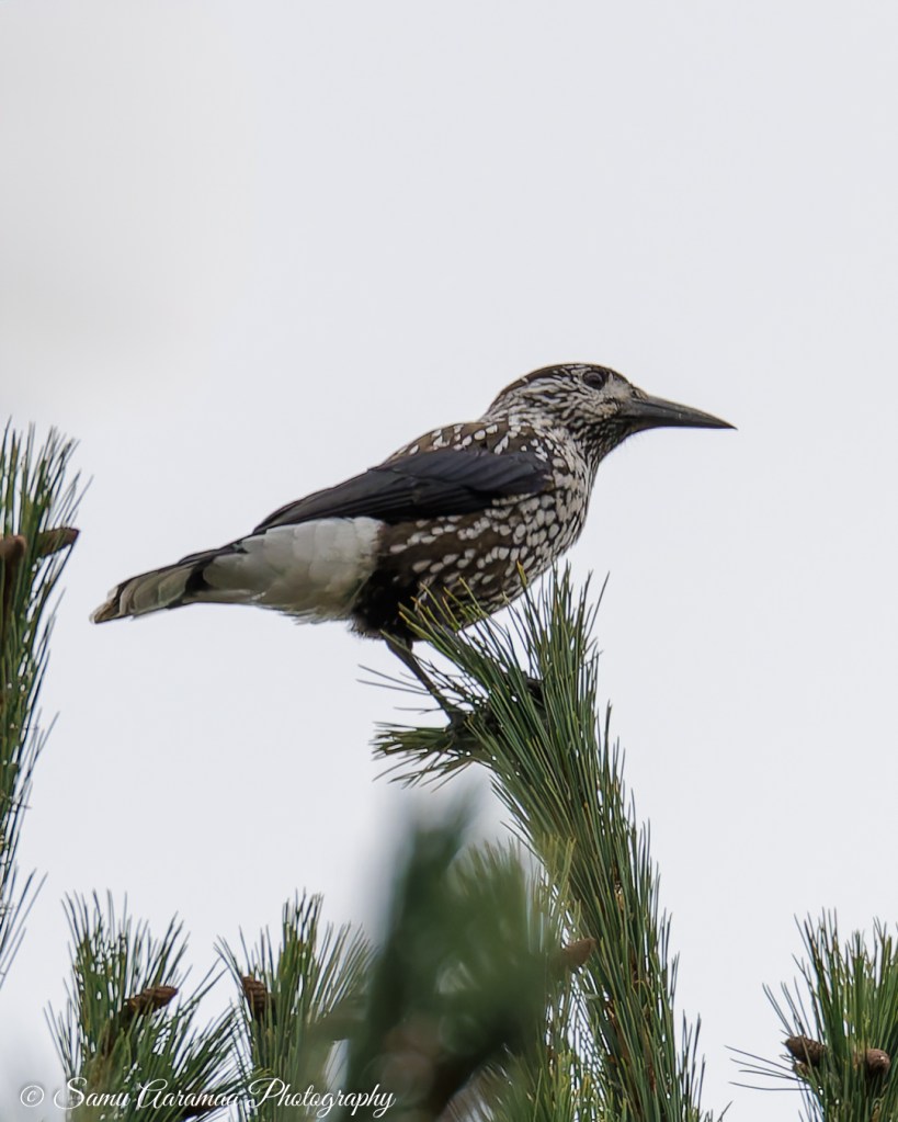 Kun sain sorsat kuvattua, pähkinähakki huuteli takaani puun latvasta, että tulepa uudestaan kuvaamaan minua. No minähän menin. Lähestyin vähän ja kuvasin, sitten taas lähestyin ja taas kuvasin. En halunnut säikyttää lintua pois. Tällä kertaa oli vähemmän tavaraa edessä, mutta edelleenkään sitä mieleistä kuvaa en saanut. Touhuni näytti kai toivottomalta, kun lintukin päätti ryhtyä auttamaan ja lensi viereiseen sembramäntyyn. Siitä sain ihan ok kuvan, mutta se huppuotos jäi vieläkin saamatta.