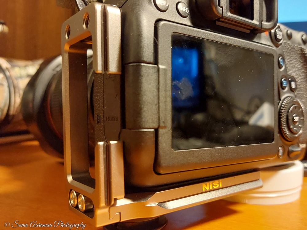 Ostin kameraan vielä tuon NiSi:n kulmakiskon (L-bracket), joka on ArcaSwiss -yhteensopiva ja sen avulla saan käännettyä kameran vaakatasosta pystysuuntaan ja toisinpäin nopeasti, sillä auringonlasku- ja nousukuvauksissa aikaa ei ole paljon. Kompositio pysyy näin samana, toisin kuin jos tekisin saman kääntämällä kuulapään avulla kameran asentoa. Kallisarvoisia sekunteja kuluisi. Ja on se muutenkin hyvä kapistus, se myös suojaa kameraa kahdelta sivulta. Eikä maksa paljon, jos sinulla ei ole L-kiskoa, niin suosittelen vakavasti harkitsemaan sellaisen hankkimista. Merkkejä ja malleja on monia. Noin 50 € tuollaisesta on hyvä hinta, 100 € on ryöstöä. Tämä kyseinen malli on vähän sinne päin, kuten kuvasta näkyy. Tuo kääntyvälle näytölle tarkoitettu kolo on muutaman millin liian alhaalla. Käytännössä sillä ei ole ollut juurikaan merkitystä. Silti R6 Mark II:lle SmallRigin kulmakisko on parempi, se on justiin eikä melkein.