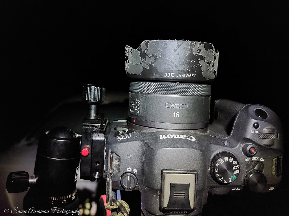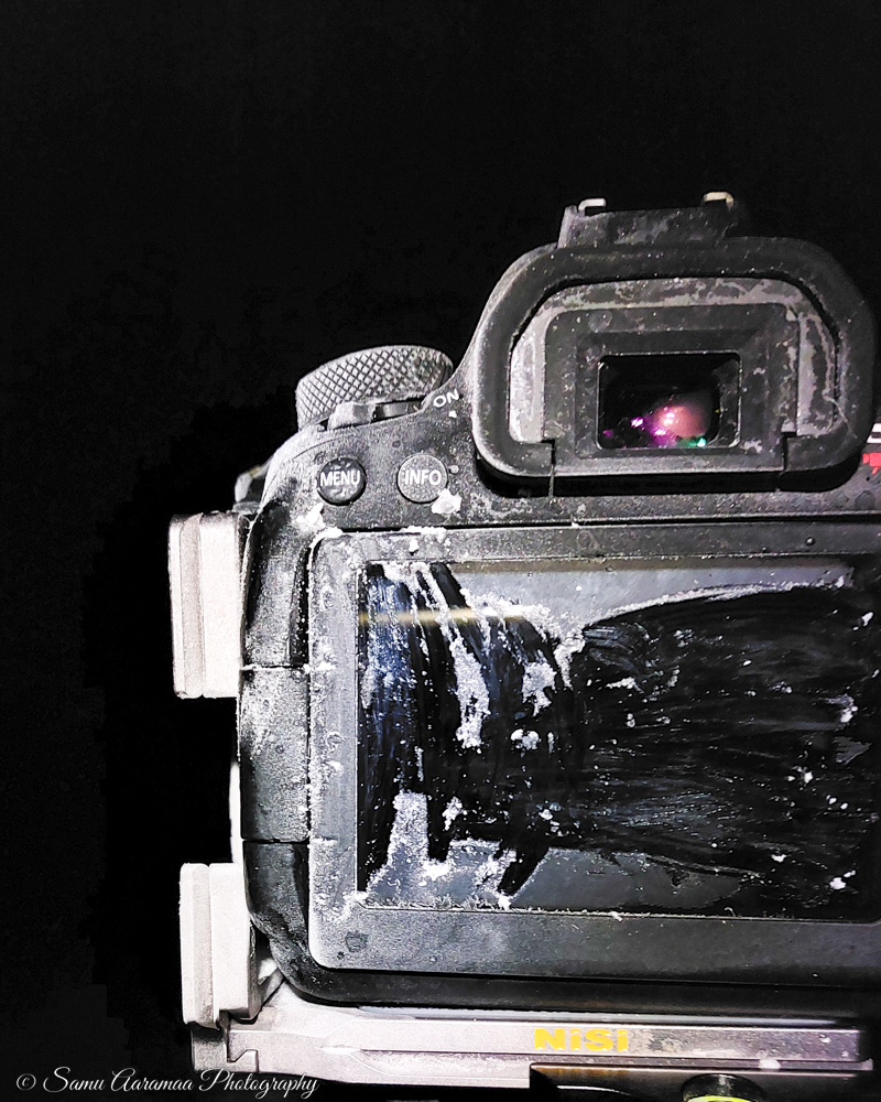 Alun perin piti paistaa laavulla makkaraa, mutta koska aika kului nopeasti kun oli kivaa niin päätimme yhdessä tuumin jättää makkaranpaiston väliin, koska molemmilla oli vielä reissun päälle muita hommia ja aamulla tekemistä. Nukkuakin kuulemma pitää. Olin kotona puolen yön aikaan ja jäiset kamerat jäivät reppuun tasaamaan lämpöään hitaasti, niin kuin kaikki ohjeet sanovat. Syynä tähän on se, ettei kaluston sisälle kondensoidu kosteutta nopean lämmönvaihdon johdosta. Linssinlämmittimet jäivät tietenkin kauppaan, joten jäätä piti rapsutella välillä linssistäkin manuaalisesti. Pakkasta ei ollut parhaimmillaankaan kuin 12 astetta, mutta näemmä sekin riitti kameroiden jäätymiseen. Tosin toimintakuntoisia ne kyllä olivat, mutta vähän kuuran peitossa.