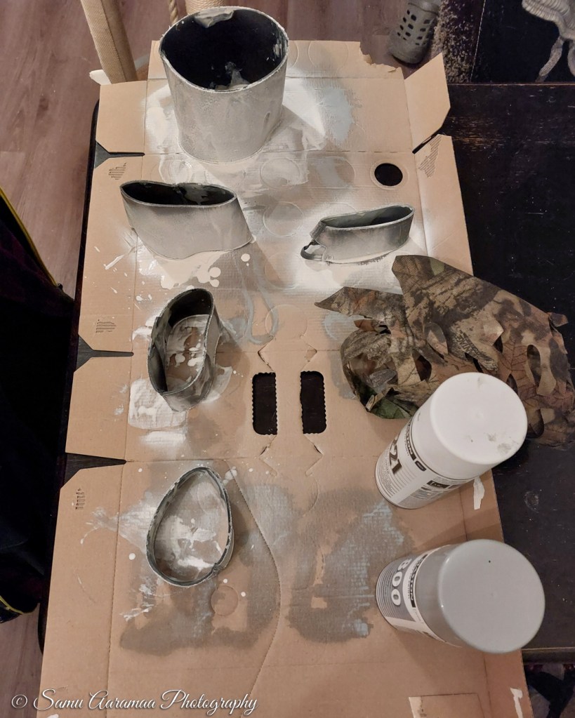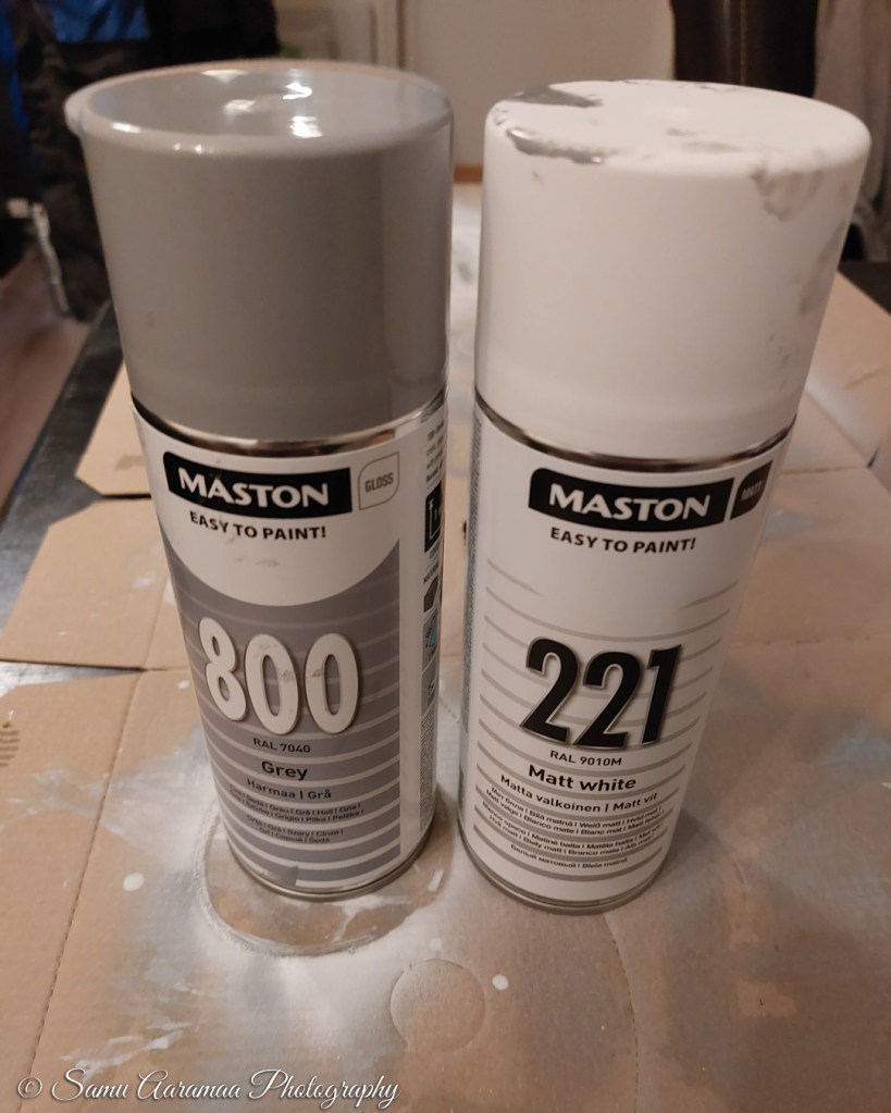 Päädyin käyttämään ylitse jäänyttä neopreenisuojaa ja tekemään siitä itse talvinaamion. Hain Tokmannilta pari maalipurkkia à 4,89 €. Väreiksi valitsin valkoisen ja harmaan. Harmaa olisi saanut olla vähän tummempi, mutta näillä mennään.