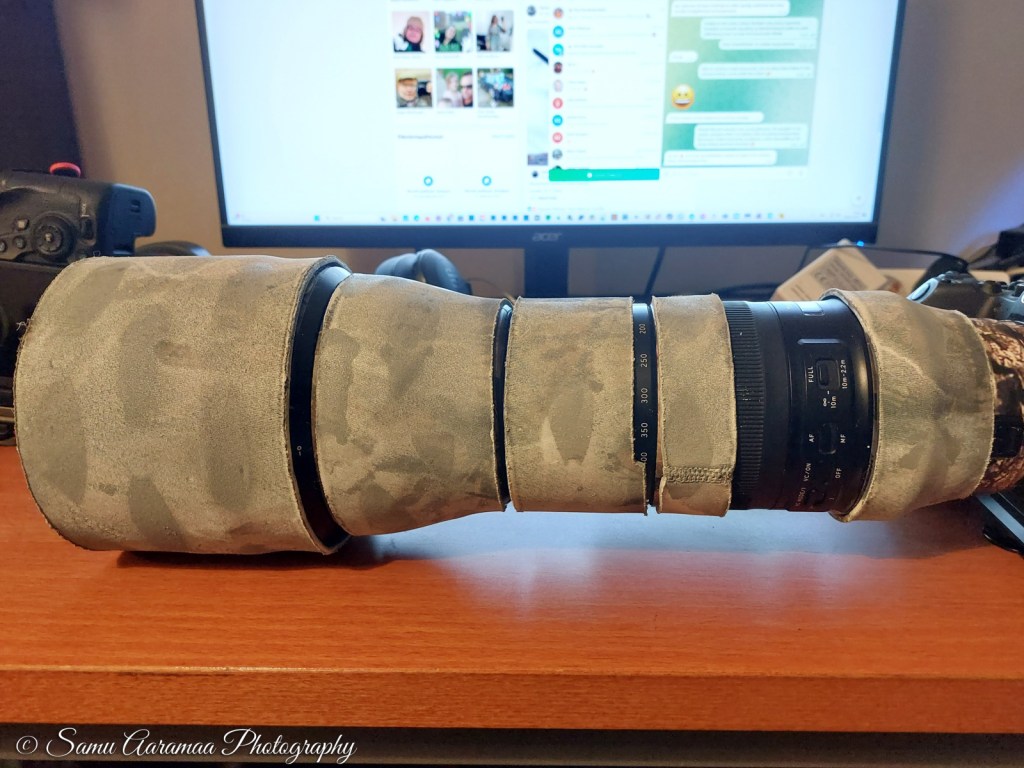 Jos et halua tehdä tätä hommaa itse, tässä on linkki valmiiseen suojaan https://www.lenscoat.com/lenscoat%ef%bf%bd-tamron-150600mm-f563-p-2830.html (Muista valita oikea kuosi)