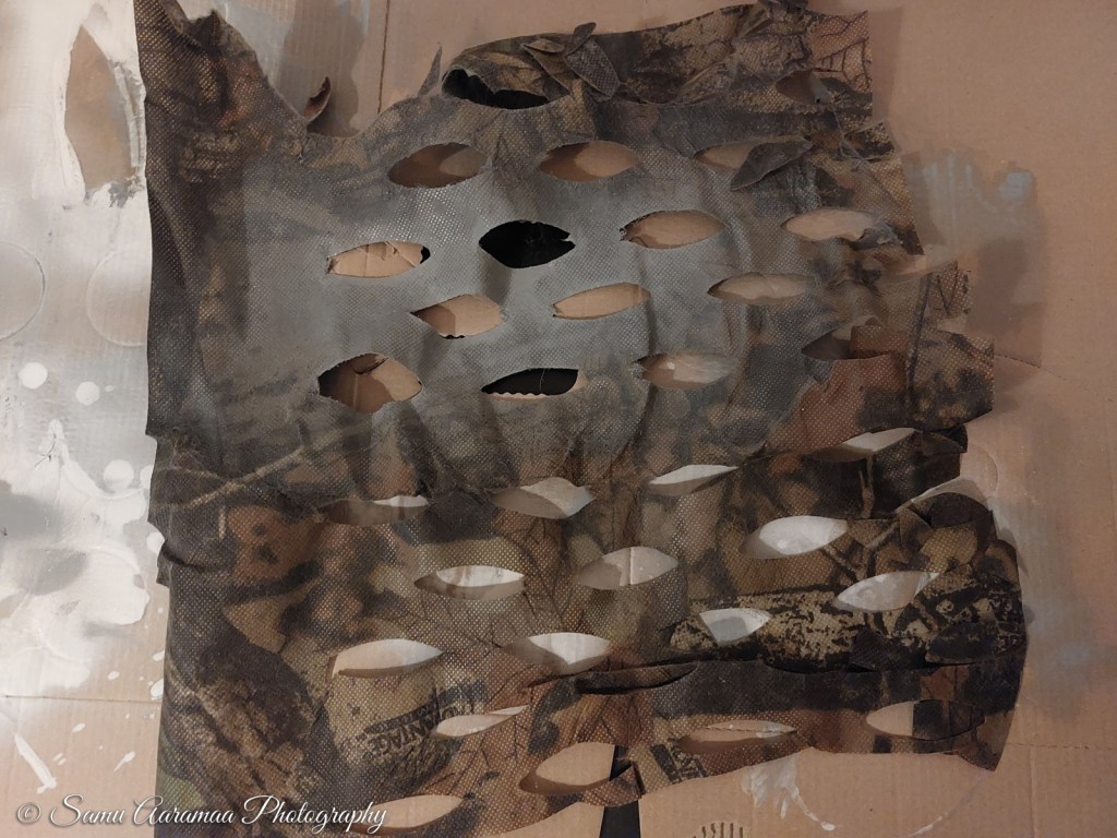 - Sabluuna, jolla tehdään kuviot (itse käytin naamioverkon palaa)