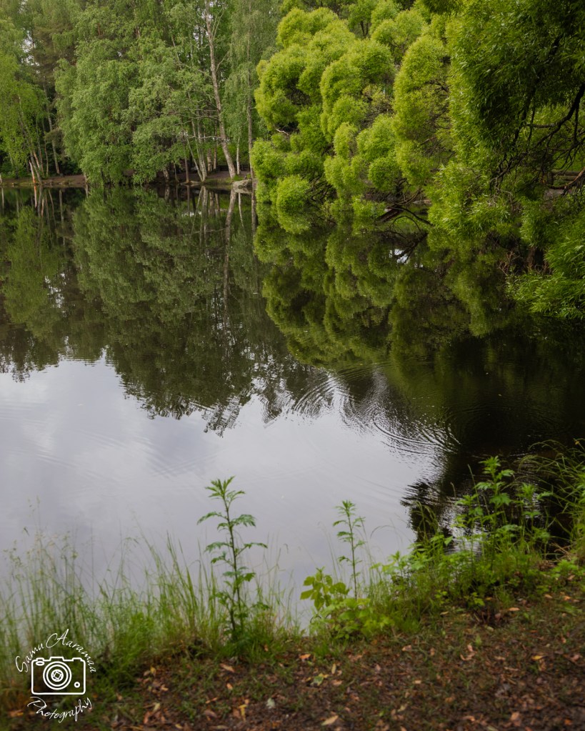 Tänään tein kaksi reissua kameran kanssa. Ensimmäisen ei ollut tarkoitus olla valokuvausreissu, vaan yritin käydä etsimässä luhtakanaa äänen perusteella, mutta se jäi löytymättä. Joko se oli hiljaa tai en kuullut sitä, kun sade rummutti pisaroita sadetakin huppuun ja peitti ympäristön äänimaailman aika tehokkaasti. Se oli vain puolen tunnin happihyppely aamutuimaan, mutta jäi siltäkin reissulta kuvia muistoksi. Kuvasin vesipisaroiden iskeytymistä lätäköihin ja puron pintaan. Näinpä siinä samalla läheltä myös sinisorsapoikueen ja laulujoutsenperheen.