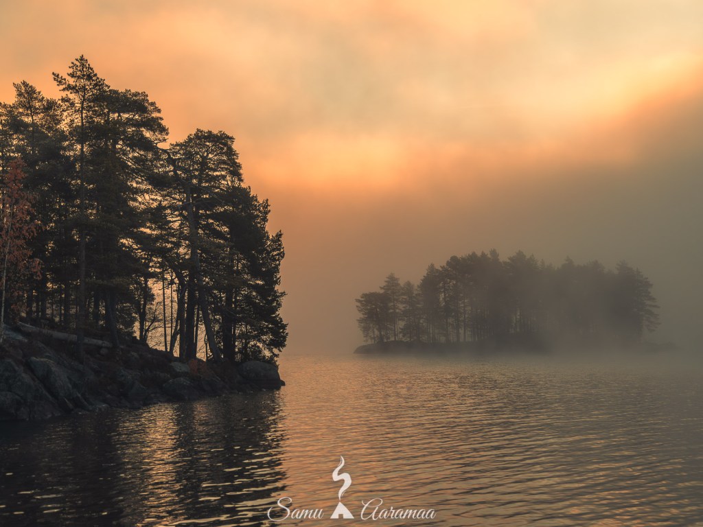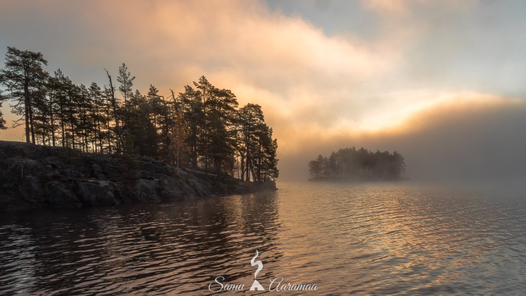 Halusin saada auringonnousukuvan Roninmaan laavun vieressä olevan saaren läheltä (kuva yllä) ja jätin toisen kameran sijoilleen ja kannoin toisen jalustoineen sinne alkuperäisen suunnitelman mukaiseen paikkaan vajaan 100 m toisesta kamerasta (kuva alla). Aurinko nousi kyllä niin kuin joka päivä, mutta se jäi pilvien taa. Järvestä kuitenkin nousi kaunis usva ja sain siitä paljon mieluisia kuvia.