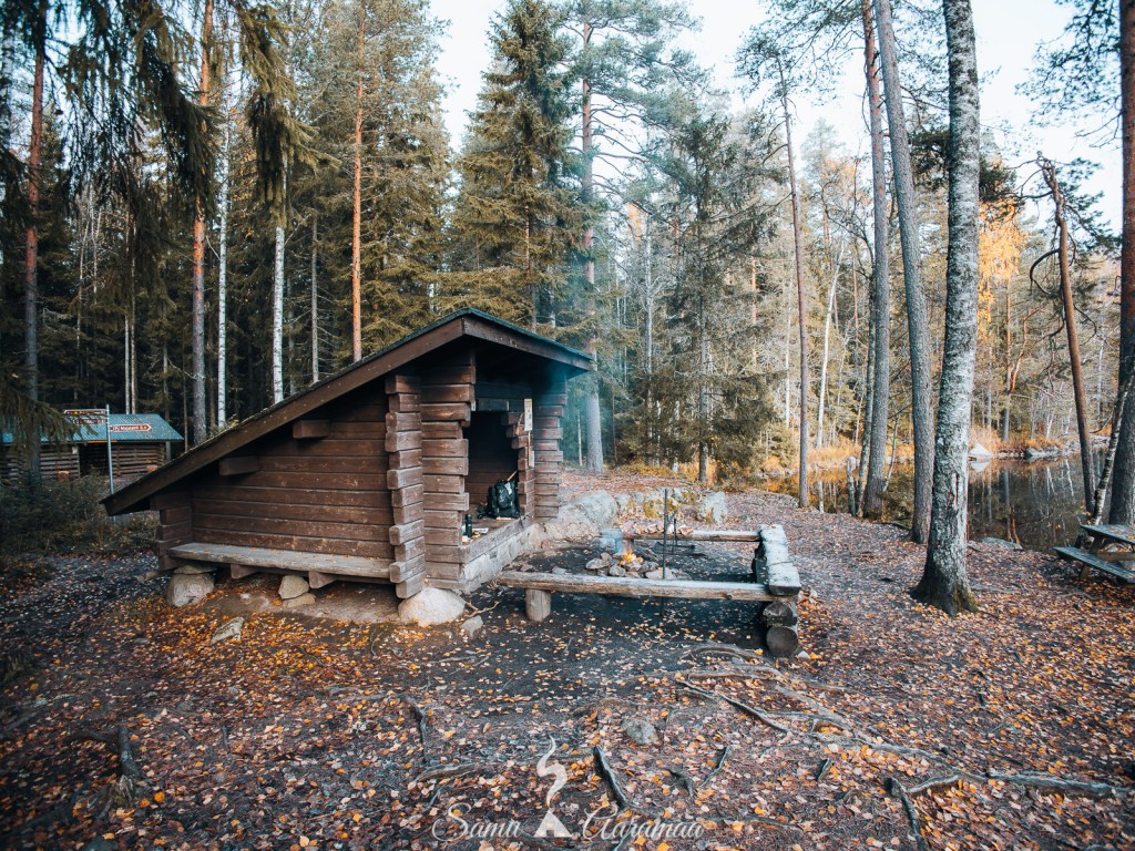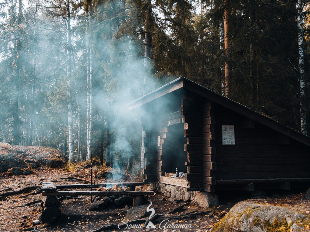 Notkuin laavulla välillä kuvaten kuvia ja videoita ja paistoin makkaroita kaikessa rauhassa. Laavun ohi meni ensin pariskunta (oletus) ja sitten kolmen hengen ryhmä retkeilijöitä. Huikkasimme toisillemme huomenet. Myöhemmin laavulle tuli kaksi turkulaista miestä tekemään aamupalaa, olivat olleet yötä jossain toisella laavulla.