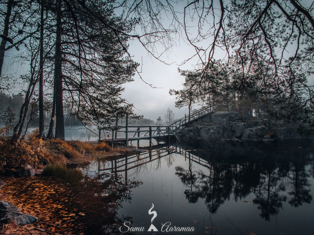 Laavulle päästyäni totesin ensin ilokseni, että siellä ei ole muita ihmisiä. Kello oli sen verran vähän, että minulla oli aikaa tutkia maastoa ja mahdollisia kuvauspaikkoja ennen auringonnousua. Kiertelin laavun lähistöllä ja laitoin kamerat jalustoille. Toisessa kamerassa oli kiinni 24-105 mm objektiivi ja toisessa 16 mm ultralaajakulma. Molemmissa on omat puolensa, niin halusin käyttää molempia yhtä aikaa, sillä auringonnousun H-hetki ei kestä kauaa.