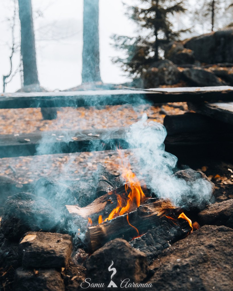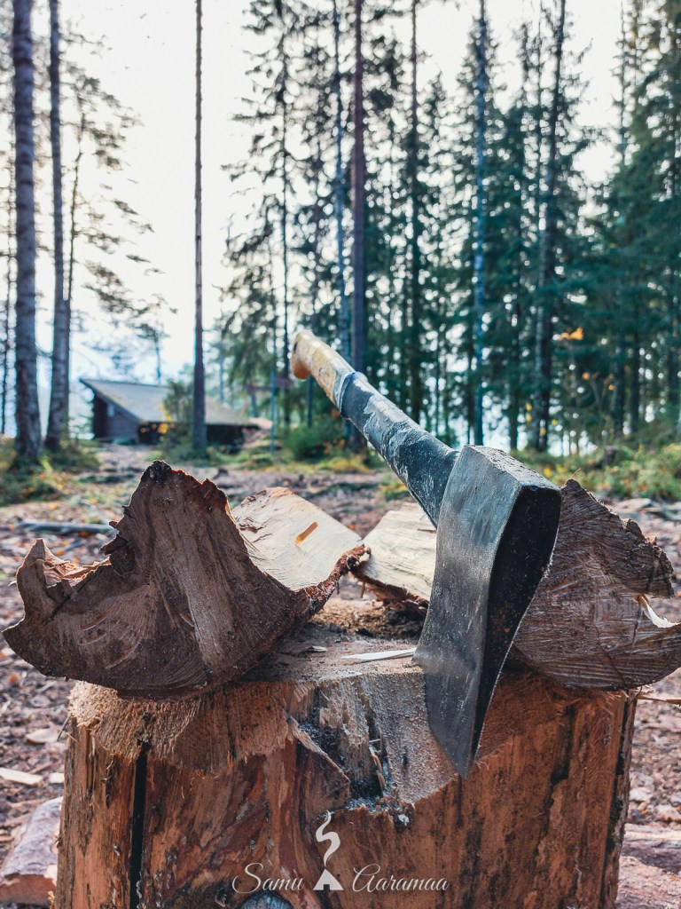 Kiireellisimmän kuvaussession jälkeen menin laavulle ja jätin tavarat sinne, kun edelleenkään ei ollut muita mailla halmeilla. Lähdin tekemään polttopuita. Ensin sahasin pitkiä puita lyhemmäksi pokasahalla ja sitten tein lyhyistä pätkistä klapeja kirveellä. Kannoin klapit sylissäni laavulle ja rupesin vuolemaan puusta kiehisiä (sytyke). Oli minulla makkaransyöntiä varten kyllä repussa paperiakin, jota olisi myös voinut käyttää sytytyksessä, mutta tykkään tehdä asioita perinteisellä tavalla. Ainakin joitakin, kuvaan kyllä diginä. Nuotio lähti palamaan ensiyrittämällä, niin kuin se on tavannut lähteä. Monenlaista tulentekijää on kyllä reissuilla nähnyt ja joillekin nuotion sytyttäminen tuntuu olevan vaikeaa. Jotkut kantavat erilaisia apuvälineitä mukana, jopa sytytysnestettä. Mutta ei se oikeasti mitään rakettitiedettä ole.