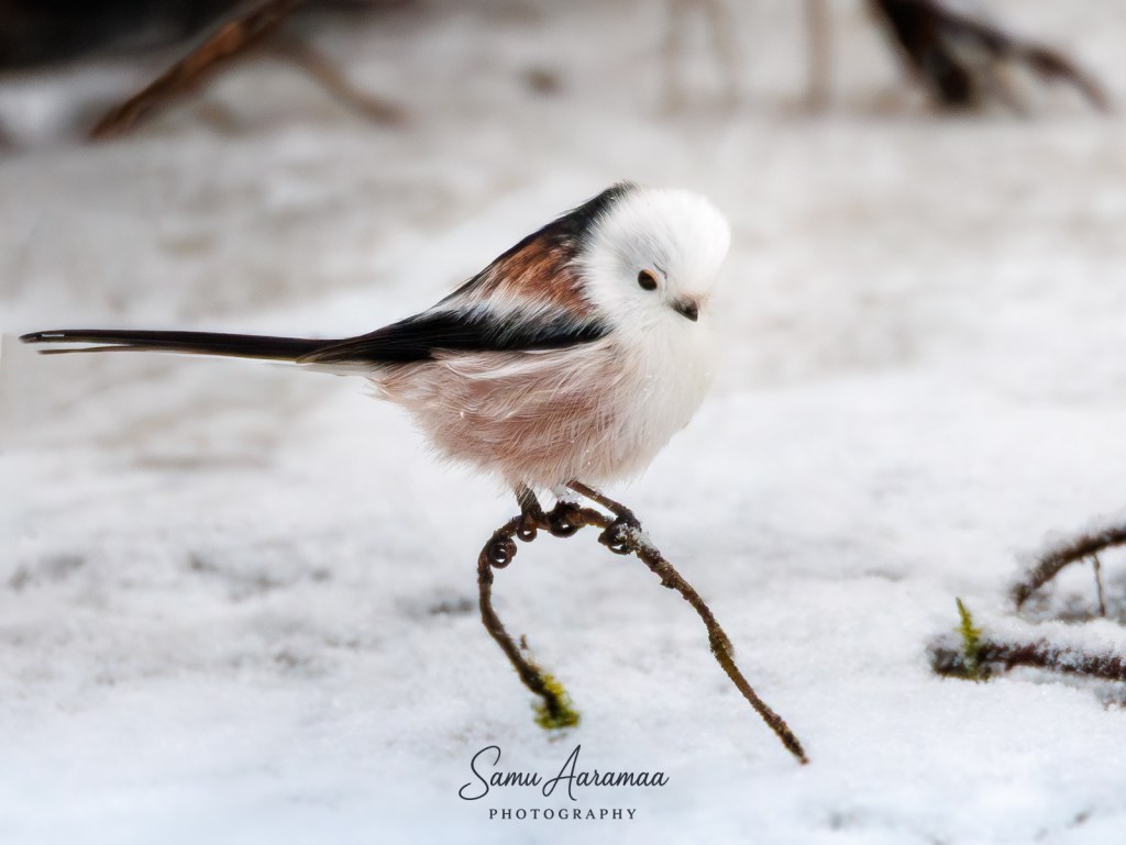 Alla olevassa kuvassa olin juuri havainnut pyrstötiaisparven ja menin metsään tulvineen järven jään viereen kyttäämään, josko linnut tulisivat lähemmäs. Ainakin niitä onnistuin ilmeisesti hämäämään, sillä ne tulivat lopulta aivan muutaman metrin päähän minusta ja sain niistä kohtuullisia kuvia.