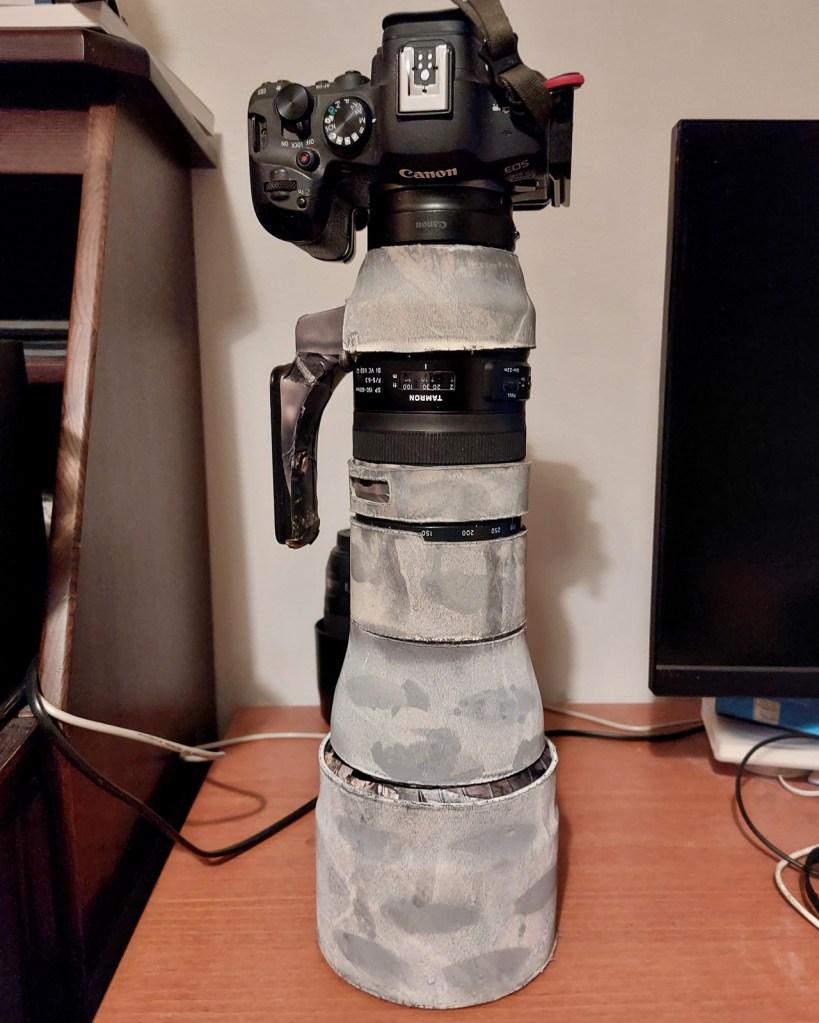 Sitten olikin objektiivin vuoro. En tiedä kuinka hyvin viime talvena valkoisella ja harmaalla maalilla naamioimani neopreenisuoja hämää eläimiä, mutta on tuota myös mukavampi käsitellä talvipakkasella, kuin jääkylmää objektiivia.