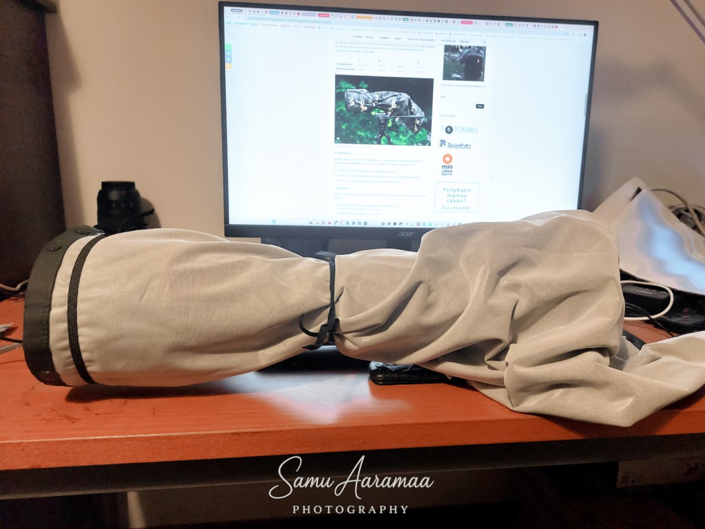 Kesäksi minulla oli jo entuudestaan metsänvihreä sadesuoja. Sen ostin syyskuussa 2023 mikkeliläisestä kameraliikkeestä (kameraliike.fi). Se on Stealth Gear Extreme 50 sadesuoja. Se maksoi silloin toimituskuiluineen noin 45 €. Onhan se parempi, sillä se on äänetön. En vielä tiedä kuinka kovaa tästä minun patentista kuuluu sadepisaroiden ropina, mutta se jää nähtäväksi. Haen vielä Puuilosta Velcro tarranauhaa, jolla on helppo sitoa tuo suoja paremmin objektiivin ympärille ja myös ottaa sadesuoja pois sateen jälkeen tai kotona. Tuo kuminauha ei ollut niin hyvä, kuin kuvittelin, mutta sitä nyt sattui löytymään kotoa.