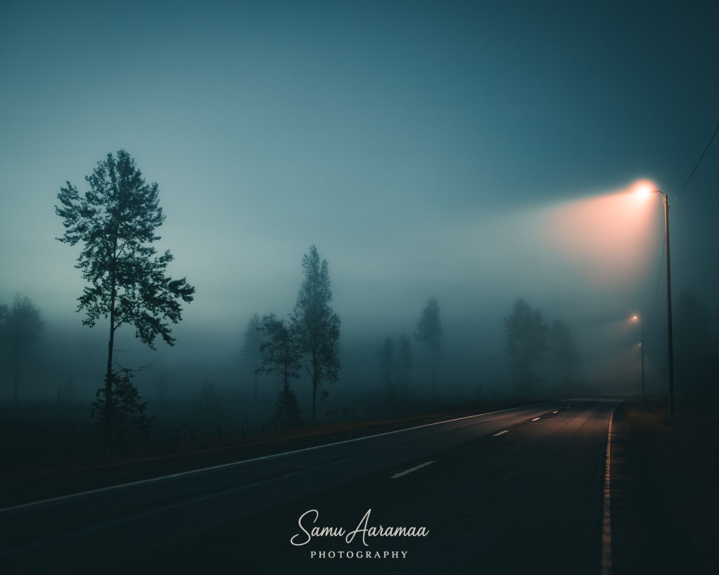 Alla olevan kuvan otin vanhalla (07/2017) ja parjatulla Canon 6D Mark II -kameralla sekä EF 24-105 mm IS USM objektiivilla (08-09/2005). kun olin menossa Valkeakoskelle kuvaamaan auringonnousua ja etsimään korentoja. Auringonnousu oli aika tylsä, jos niin voi sanoa ja korennot jäivät löytymättä, kun olin liian aikaisin liikenteessä. Niinkin voi käydä. Yö oli ollut kylmähkö ja aamuyöllä tienoo oli paksun sumun peitossa. Aamu kajasti sumuverhon läpi ja katuvalot toivat tielle omaa dramatiikkaa. Minun oli pakko pysähtyä ja ikuista tuo hetki – näistä kuvista tulikin päivän parhaita kuvia. Lintutornilla, jonka läheltä lähdin neuvojen perusteella korentoja etsimään, havaitsin mukavasti lintuja ja aamu oli varsin onnistunut. Olin märkä kuljettuani pitkän ruohikon läpi ja kylmäkin oli, mutta mikään ei saanut minua lannistumaan. Ja usein jos se mitä yrittää ei onnistu, oppii jotakin – niin nytkin. Seuraavalla kerralla tiedän mennä korentojahtiin, kun korennot ovat saaneet siipensä kuiviksi. Ja toisekseen nyt tiedän monta uutta lintutornia.
