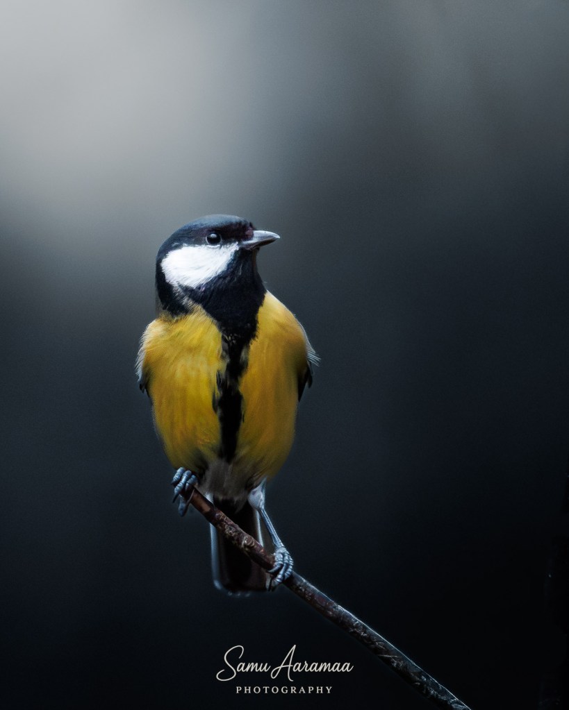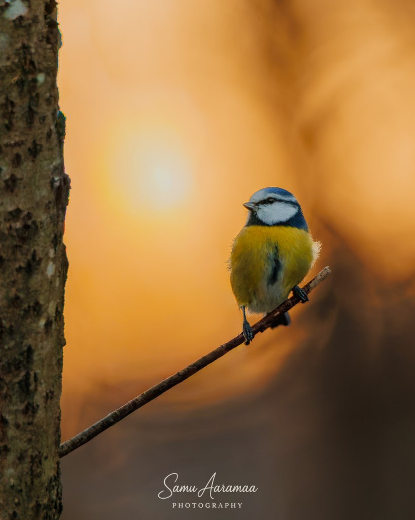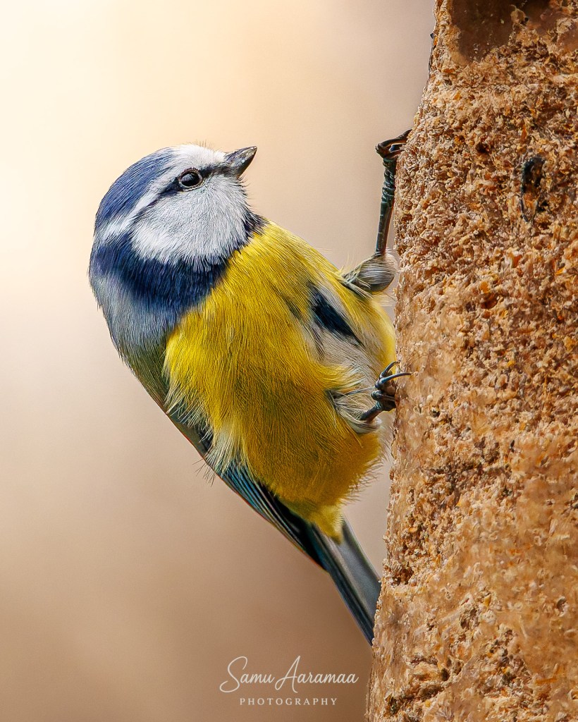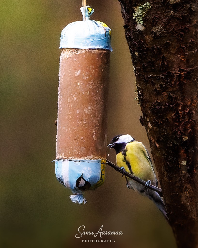 Jäin hyvän matkan päähän odottelemaan ja katselemaan mitä lintuja ruokinnalla käy. Havaitsin ainakin yhden sinitiaisen ja kaksi talitiaista (koiras + naaras), jotka kaikki kävivät vuorotellen syömässä rasvapötköä.