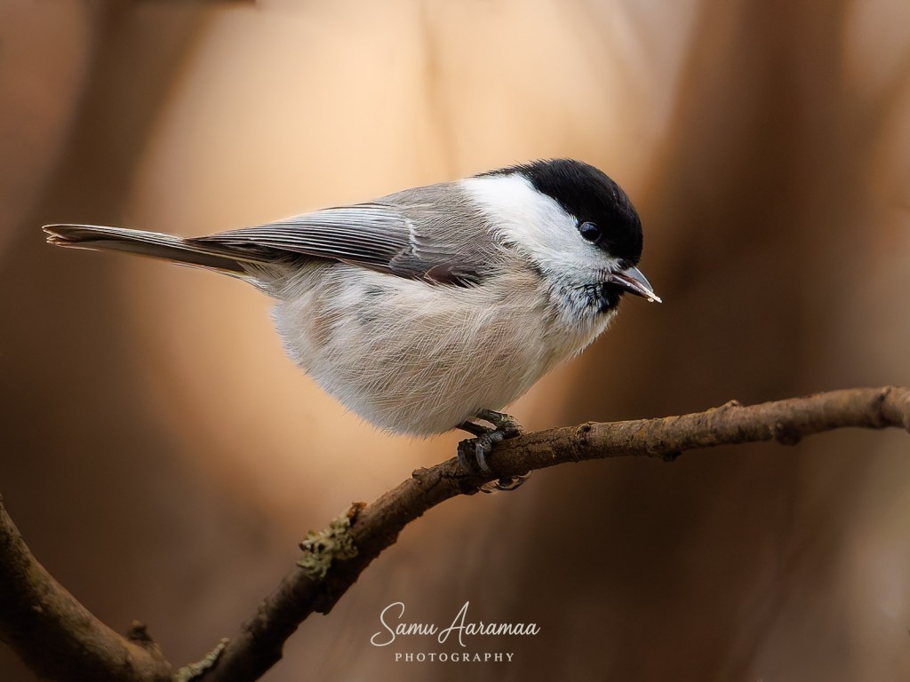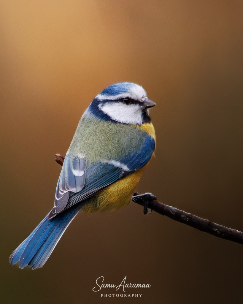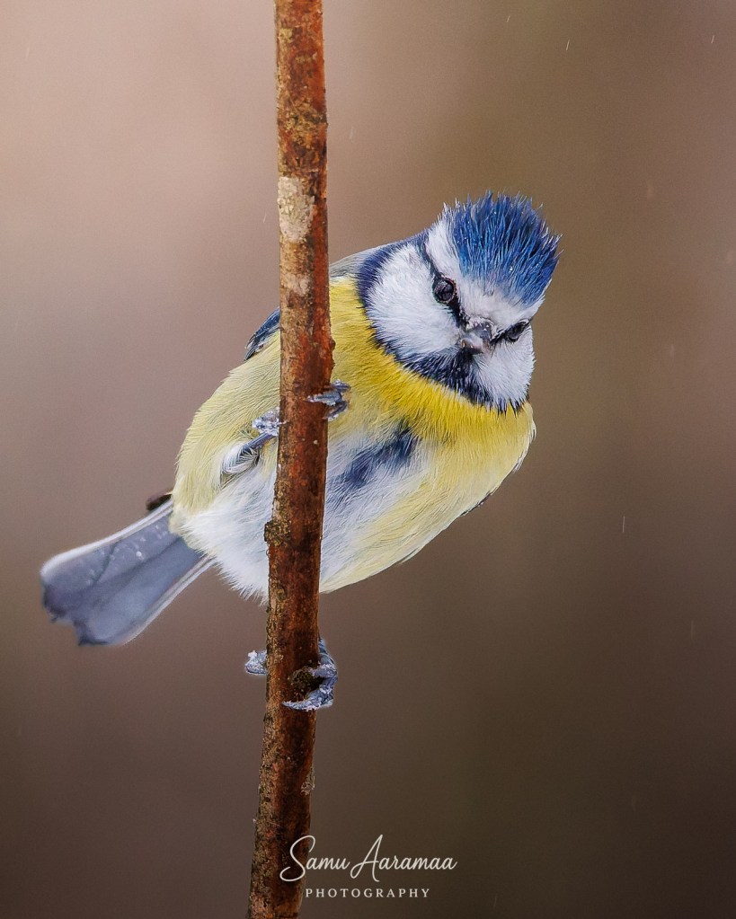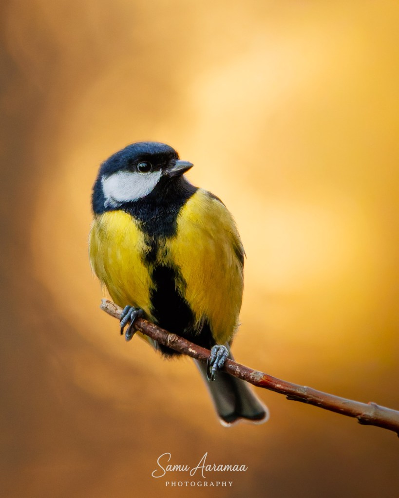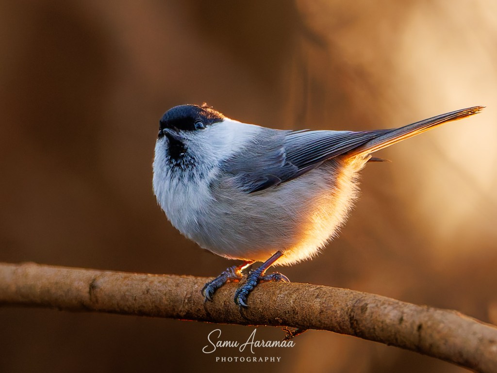 Jäin hyvän matkan päähän odottelemaan ja katselemaan mitä lintuja ruokinnalla käy. Havaitsin ainakin yhden sinitiaisen ja kaksi talitiaista (koiras + naaras), jotka kaikki kävivät vuorotellen syömässä rasvapötköä.