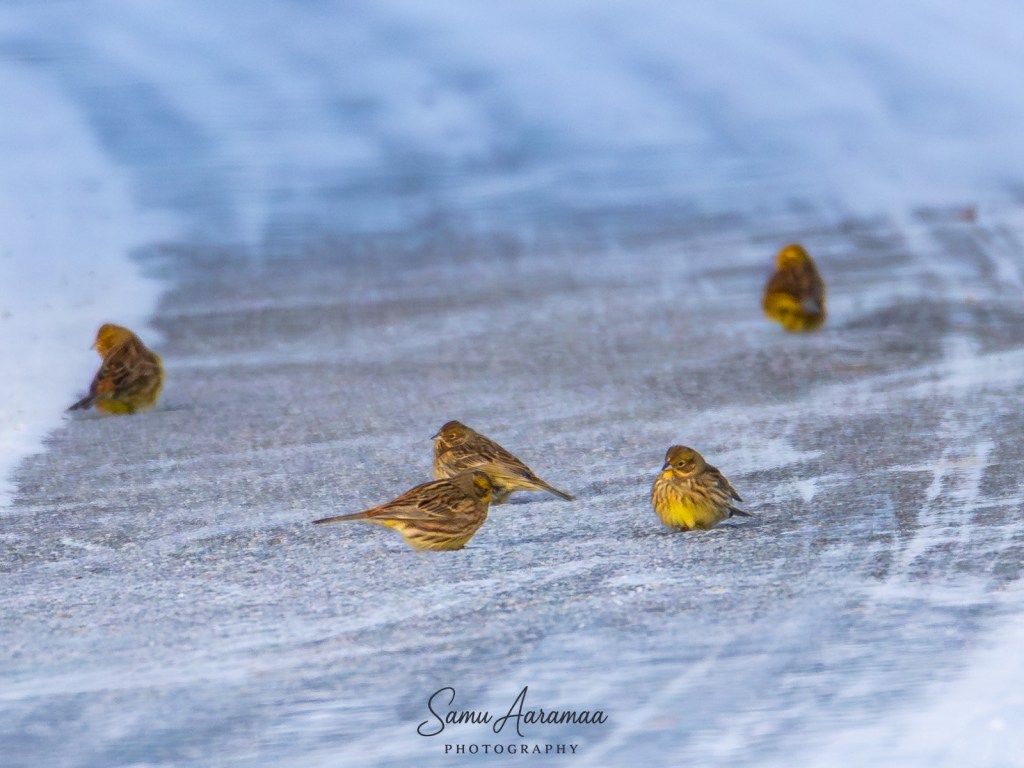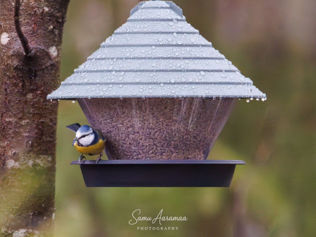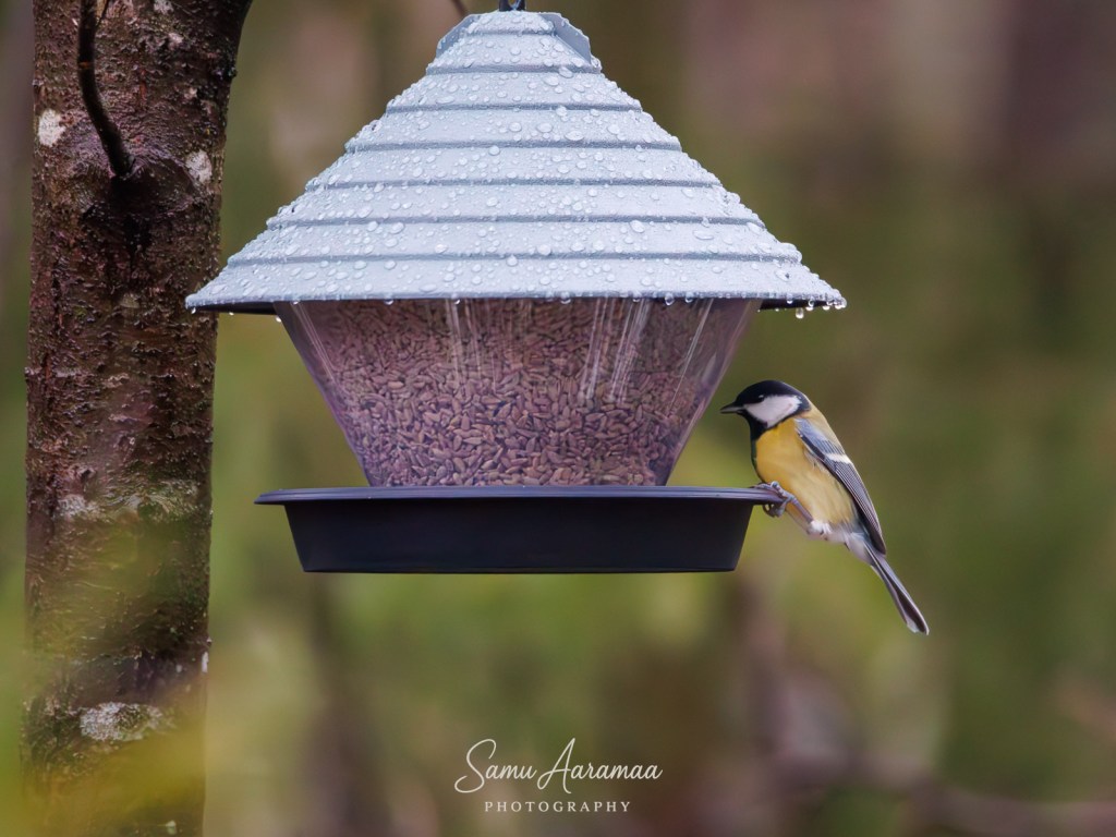 Lintuja kävi ruokinnalla aika paljon, mutta jyvät eivät näyttäneet katoavan, joten uskalsin lähteä kotikonnuilla käymään — olin varma, että ruoka riittää.