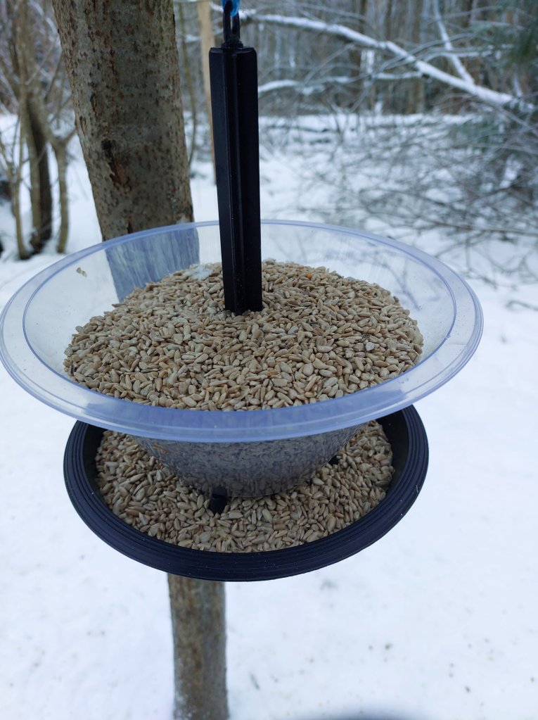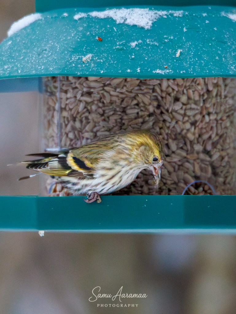 Lähes kaksi viikkoa kävin ruokinnalla tiuhaan, mutta huomasin ikävän seikan. Orthex-kota ei toiminut. Sinne jäi siemenet jumiin ja pari kertaa syöttölautanen pääsi tyhjäksi — oli aika päivittää lintulauta. Se oli noin kympin moka, ei maailma siihen kaadu. Linnutkaan eivät kärsineet, sillä maa oli vielä sula.