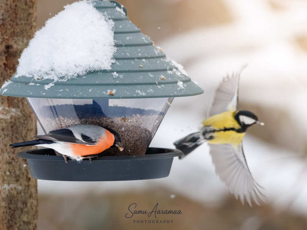 Punatulkkujen jatkuva undulaattimainen kujerrus ja pehmeät vihellykset, kuorittujen auringonkukan siementen puputtamista. Sini- ja talitiaisten kevyt visertely ja ripeät liikkeet puissa ja pensaissa, talitiaiset takoivat auringonkukan siemeniä ja maapähkinöitä, sinitiaiset nauttivat auringonkukan siemenistä ja rasva-siementangosta. Töyhtötiaisen heleä naurahtelu ja terävä kommentointi muiden keskusteluun, herkutteli maapähkinöillä. Kirkkaan kellanvihreä vihervarpunen saapuu paikalle syömään muutaman auringonkukan siemenen ja jatkaa sitten päivän muihin puuhiin toisaalle. Korkealla yllä varis ohittaa ruokintapaikan verkkaan lentäen ja harvakseltaan raakkuen. Mustarastaan arvokas ja äänetön tarkkailu sivusta hiilenmustassa puvussaan, ruokaan se ei tällä kertaa koskenut.