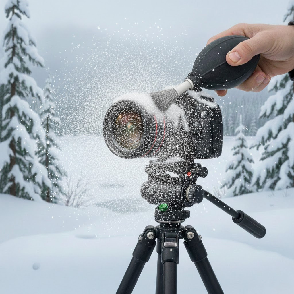 - Puhdista lumi heti: Jos kameraan pääsee lunta, puhalla tai harjaa se pois välittömästi ennen kuin se ehtii sulaa rungon lämmöstä vedeksi. Älä puhalla suulla, ettei lumi sulaa vedeksi. Pumppupuhdistimen saa esim. Prismasta. Jos etsit kokonaisvaltaisempaa ratkaisua, Fotonordicilla on tällainen Ulanzi CO26 kameran puhdistussetti.