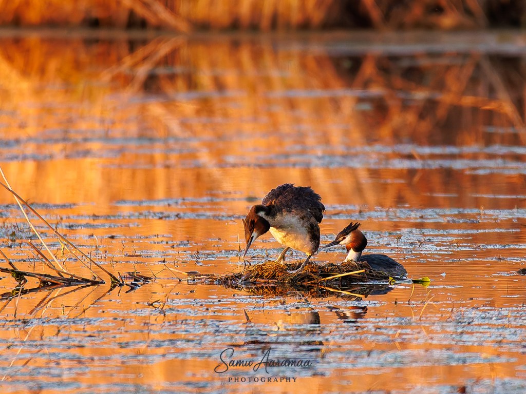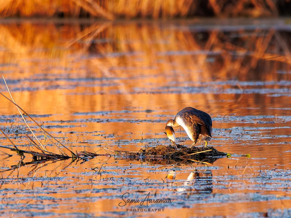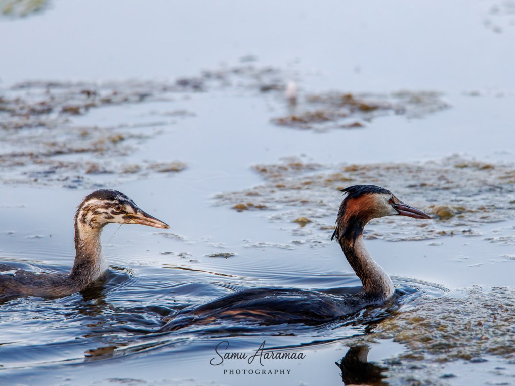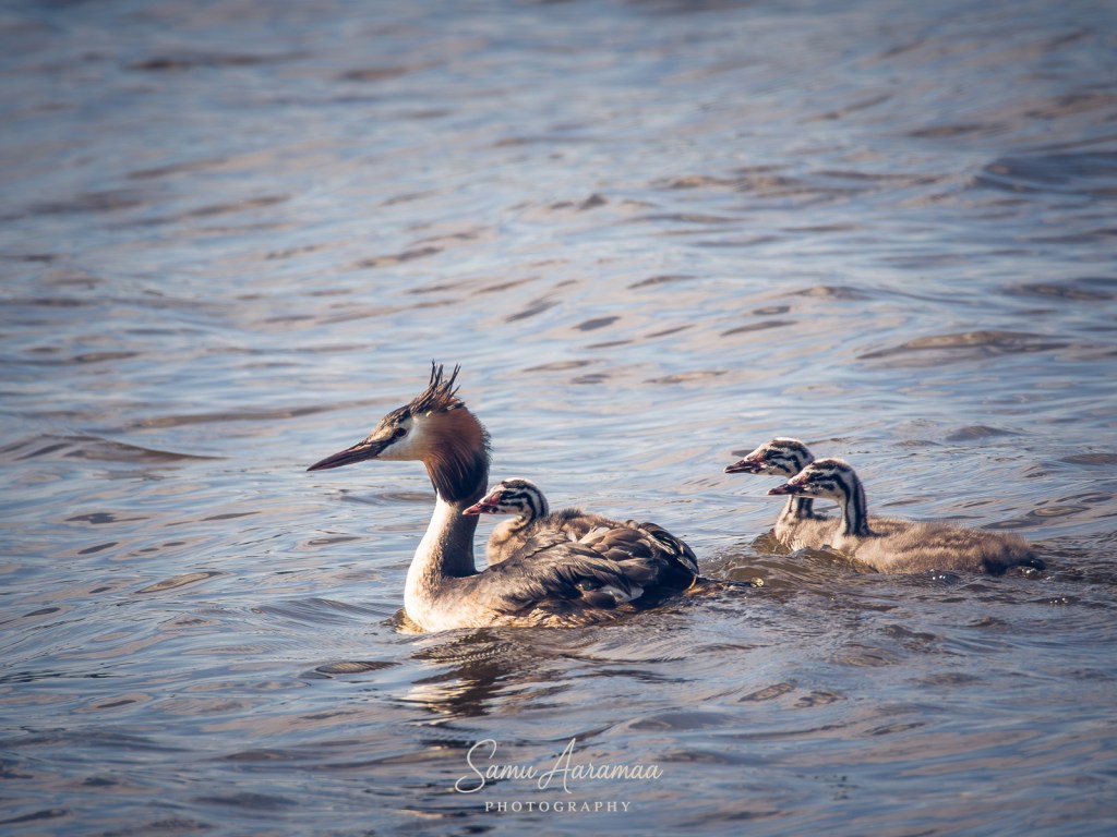 • Poikasten hoito: Myös kuoriutumisen jälkeen vanhemmat jakavat työt. Pienet poikaset kiipeävät usein emon selkään siipien suojiin, ja vanhemmat voivat kuljettaa niitä mukanaan jopa sukeltaessaan. Toisaalta toinen emoista voi keskittyä kantamiseen, kun toinen sukeltaa poikasille ruokaa.