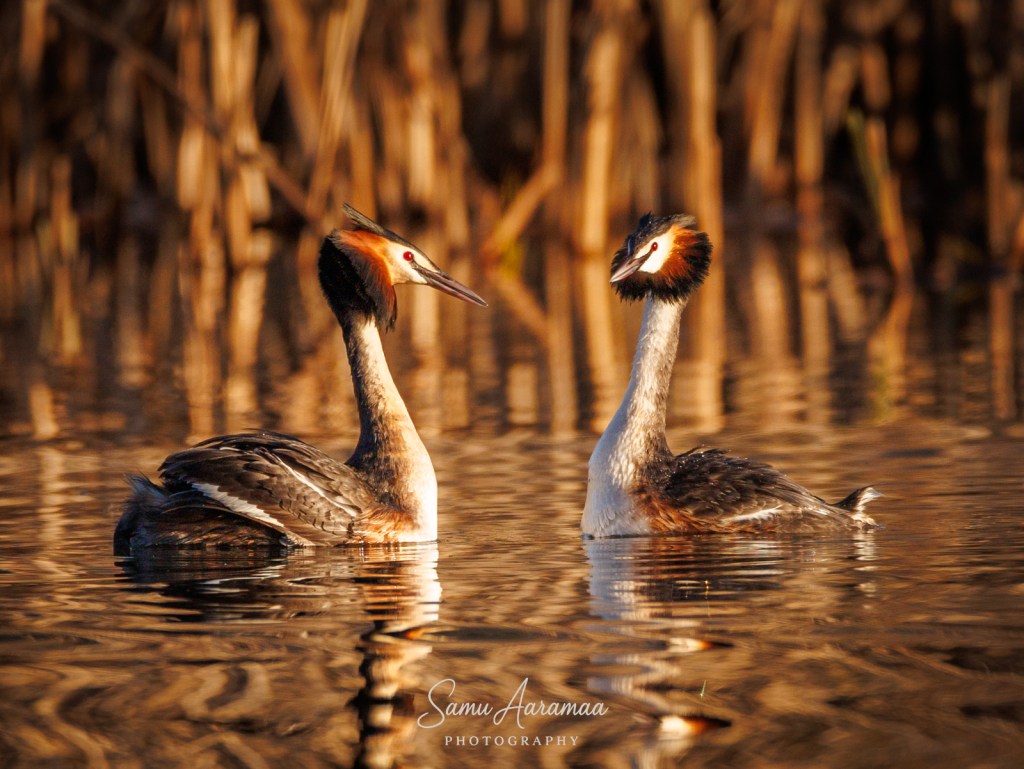 • Pingviinitanssi: Molemmat linnut nousevat pystyyn vedestä rinnat vastakkain ja kantavat nokassaan vesikasveja ikään kuin lahjana toiselle..